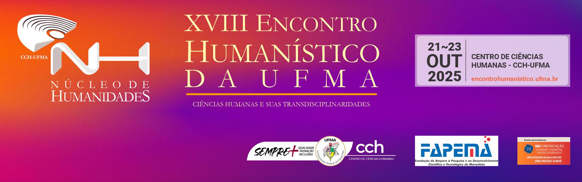 Para participar do XVIII Encontro Humanístico da UFMA: ciências humanas e suas transdisciplinaridades como ouvinte ou para apresentar um artigo é preciso estar inscrito no evento. Fique atento aos lotes, prazos e condições de inscrição: